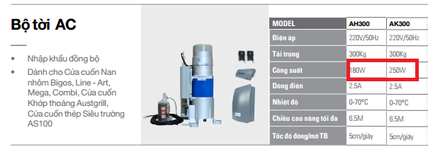 – Cùng là Bộ tời Austdoor sức nâng 300kg, nhưng công suất của loại AK300A (giá thành rẻ hơn) là 250W lại cao hơn Bộ tời AH300A xuất xứ Đài loan chỉ có công suất 180W. Ở đây quan trọng là cấu tạo bên trong của từng bộ tời, các phụ kiện, bánh răng trợ lực được sắp xếp ra sao, linh phụ kiện như thế nào để chất lượng Motor cửa cuốn tốt nhất. Ở một mặt rõ ràng đó là, Motor Austdoor AK300A sẽ tốn điện hơn Motor AH300A do có công suất cao hơn, sử dụng điện nhiều hơn trong một chu kỳ đóng mở.