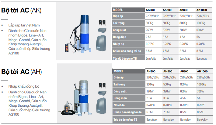 – Motor Nhập khẩu Đài loan có ký hiệu là AH: AH300A, AH500A, AH800A,… tương đương sức nâng là 300kg, 500kg, 800kg,.. Loại Motor cửa cuốn này cao cấp nhất của Tập đoàn Austdoor